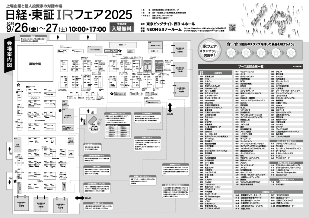 日経・東証IRフェア2025」は、日本経済新聞社と日本取引所グループ(JPX)が共催する、個人投資家が上場企業と直接対話できる国内最大級のIR(Investor Relations)イベントです投資に役立つ講演や会社説明会が多数実施され、2025年9月26日(金)と27日(土)の2日間、東京ビッグサイトで行われました。