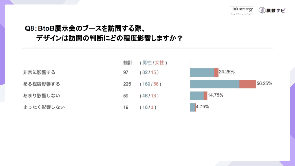 おしゃれな展示会ブースが求められる背景には、来場者の心理と展示会の構造的な課題があります。BtoB展示会来場者の動向調査においては、「ブースを訪問する際にデザインが判断に影響するか?」という質問に対し、80.5%が「影響する」と回答しました。