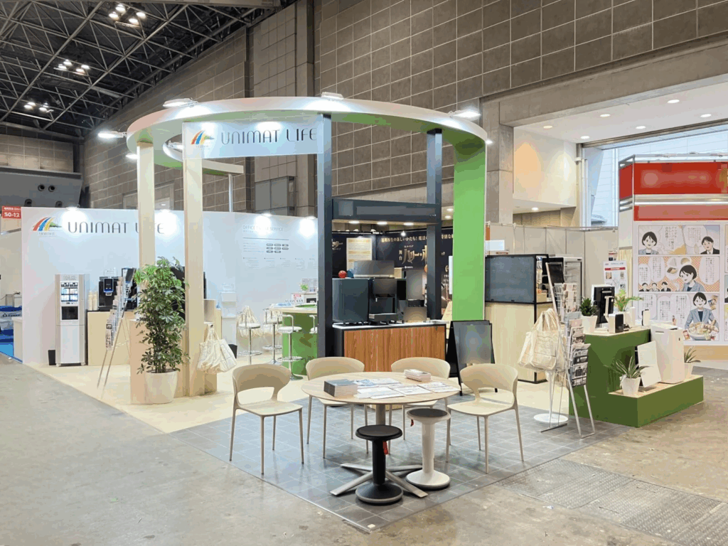 デフィデ株式会社さまのブースは、クライアントの要望を反映したシンプルかつ洗練されたデザインが特長です。コーポレートカラーである黒と緑を基調とし、高級感と清潔感を両立した空間を実現しました。来場者が実際にサービスを体験できるよう展示台を配置し、製品機能だけでなく、導入メリットまでを視覚的に伝える構成としています。