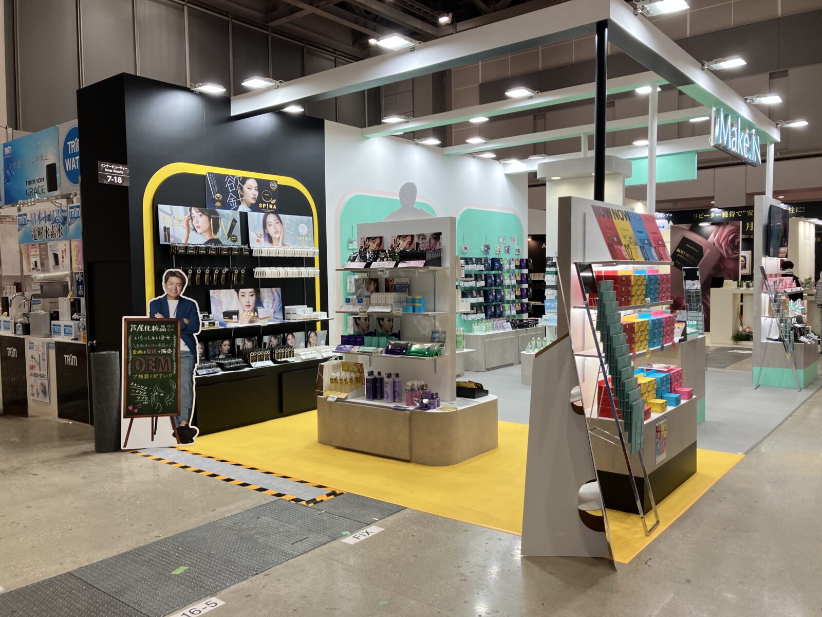 | 詳細 | 2026年1月14日〜16日に開催された第16回 COSME Week 東京 国際化粧品展 にて、株式会社EVLISSさまさまの展示会ブースのデザイン・設計・施工を担当しました。同一ブース内に2つのブランドを展開するにあたり、「ブランドイメージが混在しないこと」と「空間としての統一感」を両立させることが課題でした。そこで、展示台や上部構造は共通デザインとしながら、床・壁面・背面構成をブランドごとに明確に区分けする設計を採用。来場者が一目でブランドの違いを認識できる空間としています。右側をエメラルドブルーを基調にした親しみやすいブースと、左側をイエロー×ブラックによる力強くスタイリッシュなブースを同一空間に成立させ、見やすさ・入りやすさを意識した展示会ブースにいたしました。 |